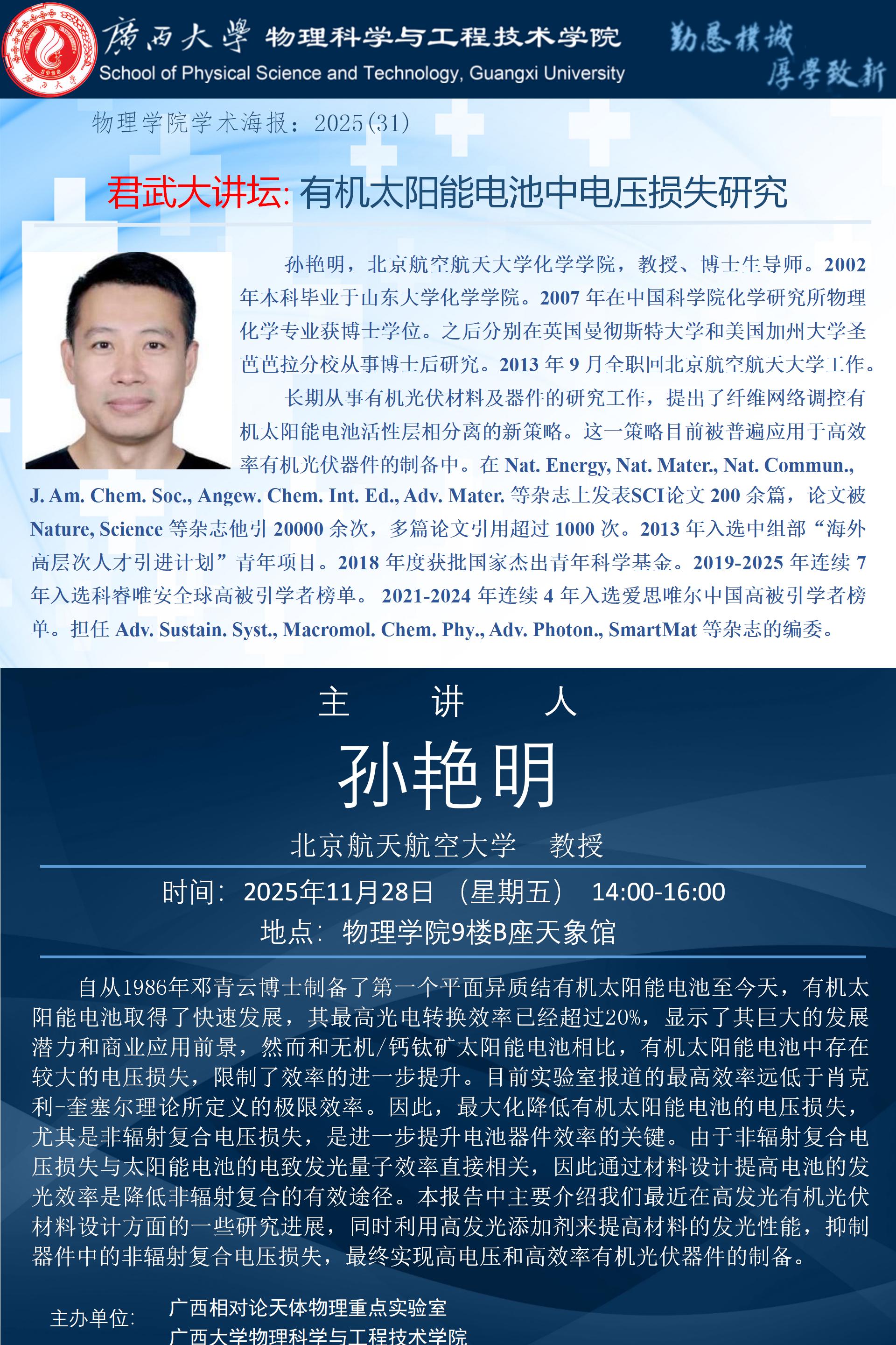 君武大讲坛、物理科学与工程技术学院学术报告:有机太阳能电池中电压损失研究