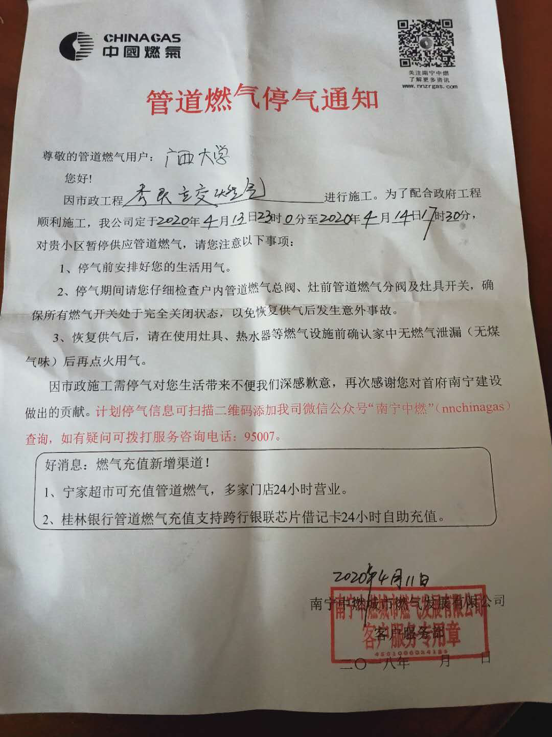 根据南宁中燃城市燃气发展有限公司客户服务部的通知,beat365的管道燃气将于2020年4月13日23时0分至4月14日17时30分暂停供应,详见附件。请各住户做好停气准备。不便之处,敬请谅解。