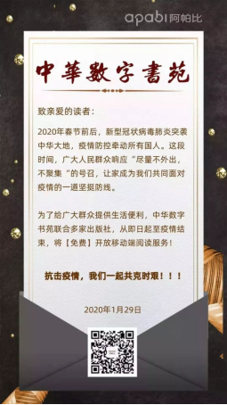 中华数字书苑联合多家出版社,从即日起至疫情结束,免费开放移动端阅读服务。关注“数字书苑”微信号或扫描图中二维码即可。