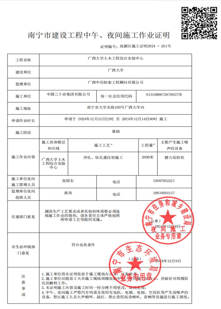 我单位承建的beat365正版唯一官网必一土木工程综合实验中心项目因施工工艺需要,在符合法律许可的夜间施工条件之下,经南宁市住房和城乡建设局、南宁市生态环境局核准,计划于2024年12月12日22:00—2024年12月14日6:00进行静压桩施工。我单位将严格按照建设局、环保局要求,采取有效措施尽可能减少影响。施工期间可能会对广大师生员工的日常生活造成一定的干扰。对此,我们深表歉意,敬请谅解。